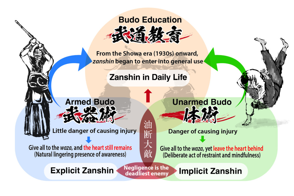 In short, the zanshin learned through budo is understood as a state of tightening and focusing both mind and body, and it is recognised as a concept that is also useful in daily life. It encourages attentiveness to one’s surroundings and care in one’s own actions, and is proposed as something that can be applied in many areas of life, from human relationships to work. By being aware of how one’s words and deeds affect others, one becomes more perceptive, and is able to cultivate better judgment directed toward long-term goals. This, it is argued, is the aim of budo education, and at the foundation of this ideal lies zanshin as a new, macro-level and philosophical way of thinking.