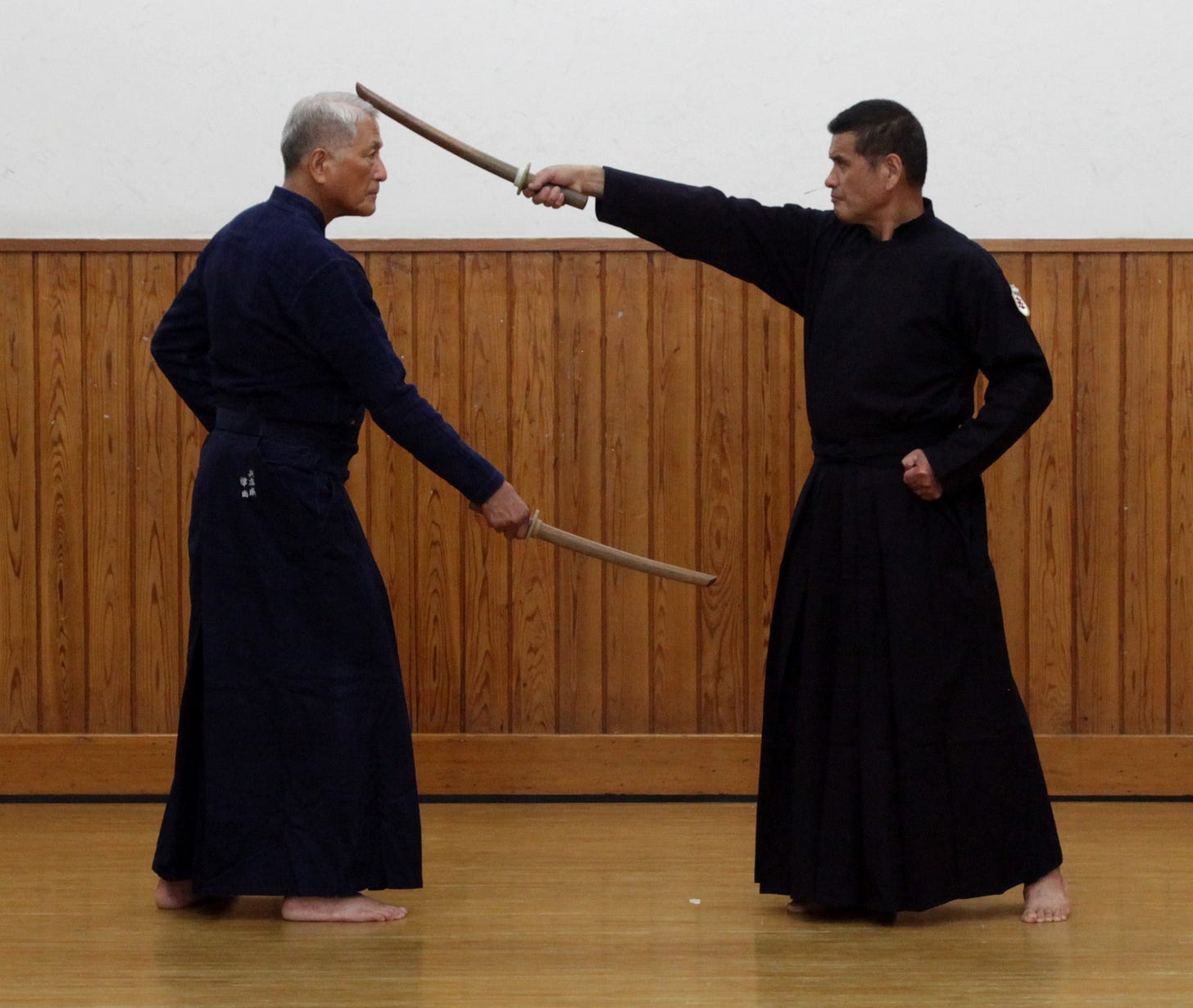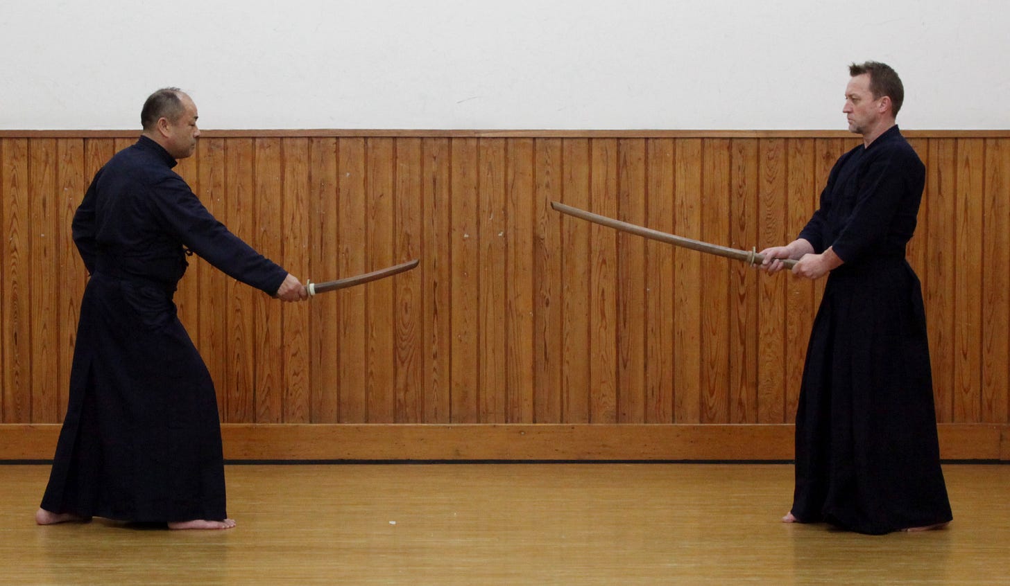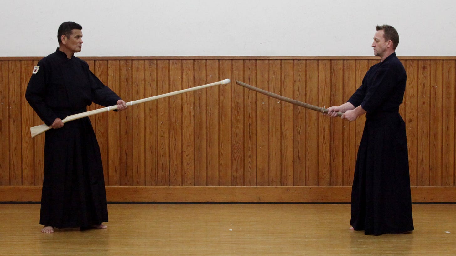 Tankendo and jukendo kata come in many combinations. Mokujū versus mokujū. Tachi (sword) versus mokujū. Tanken versus mokujū. Tanken versus tachi. Tanken versus tanken. Did I get them all? Each pairing forces you to recalibrate your sense of distance from scratch. You cannot coast on habit. The maai that keeps you safe but ready to strike in one exchange will get you well-and-truly skewered in another. This constant recalibration is exhausting, but it is also very educational.