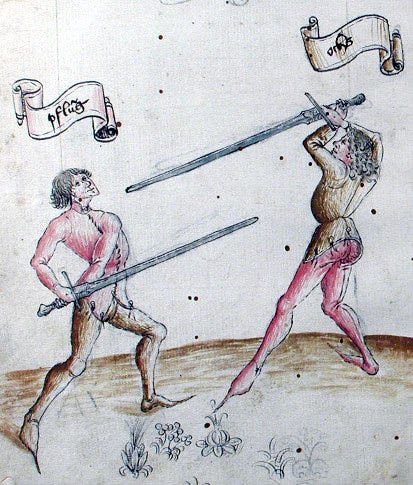 There are, of course, a few exceptions, albeit rare. The Nicolas Pol Hausbuch (MS 3227a, above grpahic), a German book now held in Nuremberg, was likely compiled in the late 14th or early 15th century and contains a mix of practical and esoteric material, including fencing. Although it is often wrongly attributed to Hans Döbringer, only a short addendum reflects his work; the rest of the fencing material is anonymous and attributed to the so-called Pseudo-Döbringer, who explains and expands upon the teachings of the sword master Johannes Liechtenauer.
