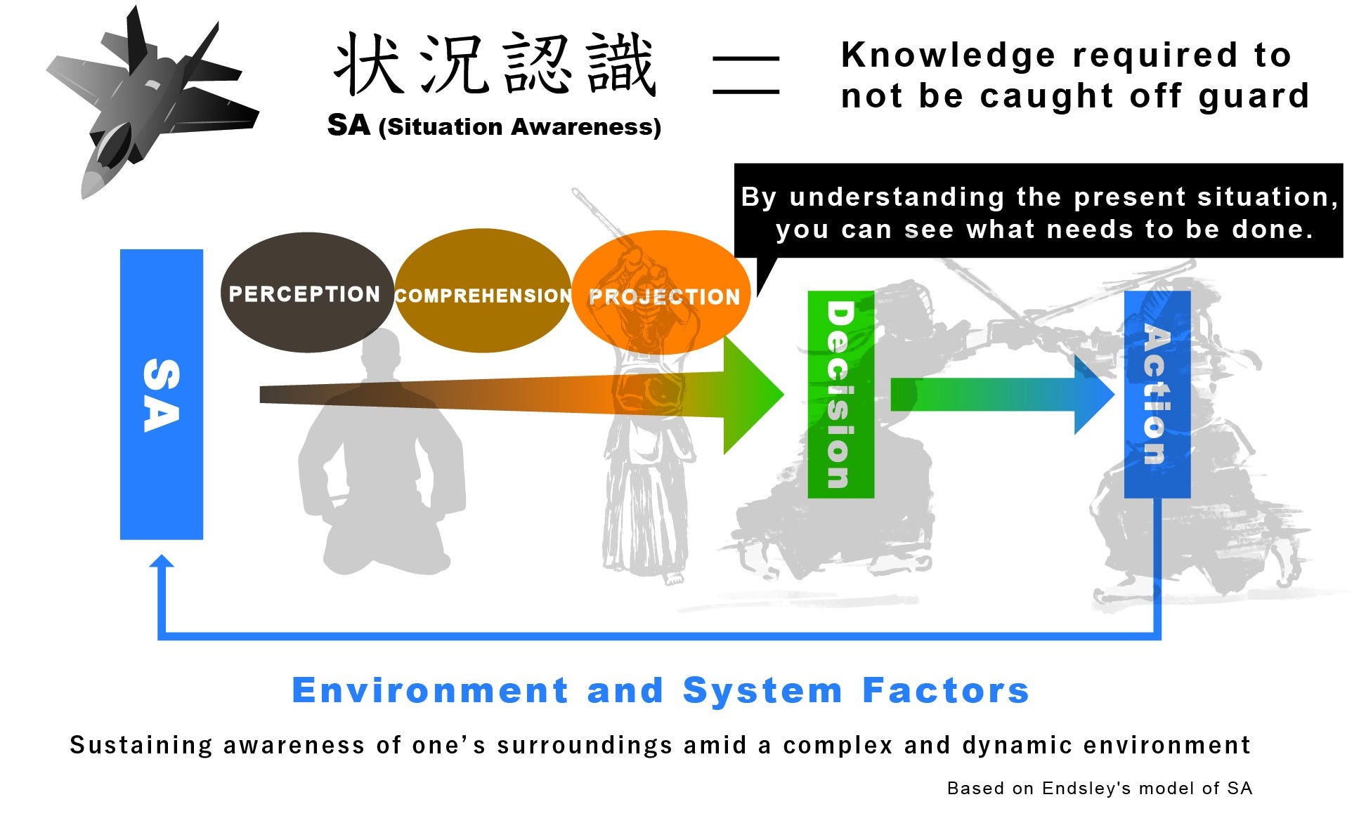 Thus, while closer examination reveals loose points of overlap, the multifaceted structure implied by the single term zanshin, and its applicability across many dimensions of combat, appears to be genuinely distinctive within Japanese budo. That said, in recent years a term in Western contexts has increasingly been treated as equivalent to zanshin. This is the concept known as situational awareness (SA).