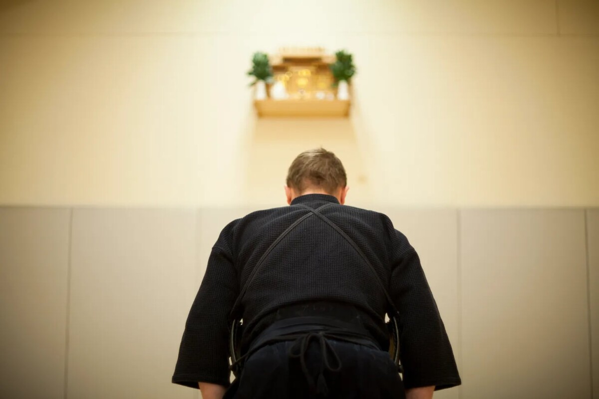 Making eye contact when bowing to one’s opponent is an extremely important aspect of etiquette in budo. From a typical Japanese social perspective, however, looking directly into someone’s eyes while greeting them may feel unnatural. In some contexts, especially toward a superior, sustained eye contact can even be considered disrespectful. Yet in budo, when one bows to an opponent, one meets their gaze.