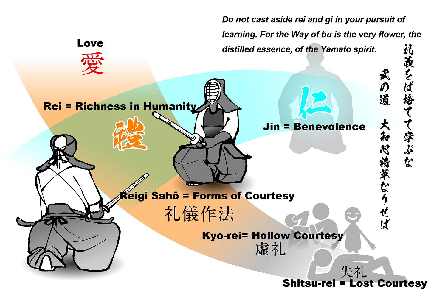 Rei (礼) is usually translated as “courtesy”, “manners”, “politeness” or “ritual decorum”. It also refers to the act of prostration, and in the dojo “Rei!” is called out as a command to bow. In budo terms, however, it is not merely bowing. It encompasses knowing one’s place, showing respect, observing proper conduct, and maintaining outward composure. In short, it regulates behaviour. Gi (義) is usually translated as “righteousness”, “justice”, or “moral rectitude”. It refers to doing what is right because it is right. In the samurai context, it signified integrity, moral backbone, and acting according to principle rather than convenience. Together, reigi denotes proper conduct grounded in moral awareness. In modern Japanese it is often rendered simply as manners or courtesy, but within budo these intertwined virtues form one of the central foundations of its ethical thought.
